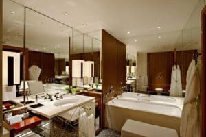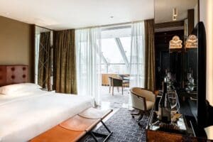 The hotel features 206 spacious rooms and suites, each thoughtfully designed with elements of Feng Shui to ensure a harmonious and restful environment. Accommodations include the Winter Garden Suite, which boasts a glass-enclosed living area under a skylight, and the Penthouse Suite, offering panoramic views of the city. All rooms are equipped with modern amenities such as high-speed internet, interactive television, and luxurious bathrooms with heated floors and premium toiletries.