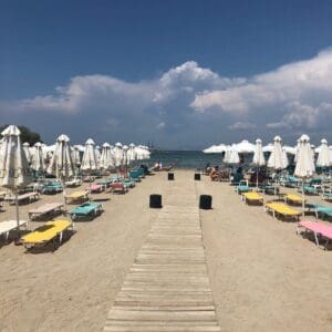In addition, there are 3 beach bars open from early in the morning. As a bonus, parents and teens can also use the swimming pool here at the Balux Beach. The swimming pool is not suitable for kids. When the sun starts to set, the vibe on Asteras Glyfadas becomes more partylike. The pool attracts lots of young people listening to the DJ and the beach becomes a romantic spot for cocktails.