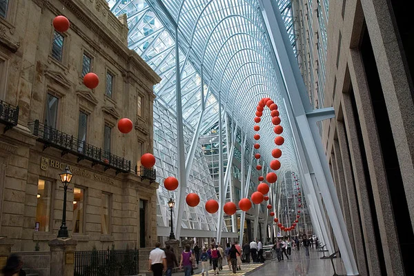 Brookfield Place, located in the heart of Toronto's financial district, is a stunning architectural complex that serves as a vibrant hub for commerce, culture, and community. Opened in 1990, the complex features a striking glass atrium that showcases an impressive 12-story skylight, allowing natural light to flood the space and creating a sense of openness and elegance. Brookfield Place is home to a variety of high-end retailers, restaurants, and office spaces, making it a bustling centre for both professionals and visitors. The complex also houses the renowned Allen Lambert Galleria, a breath-taking public space that serves as a gathering spot for events and social activities, highlighting the integration of art and architecture in an urban environment.