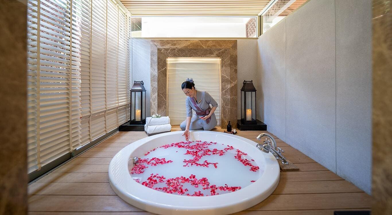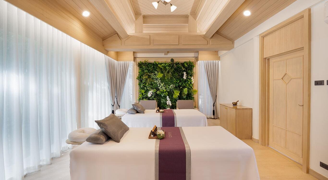Inside, guests can enjoy private spa suites equipped with steam rooms, jacuzzis, rain showers, and views of tranquil greenery. The treatment menu includes signature massages, herbal compress therapy, milk baths, and exfoliating scrubs using premium products like HARNN and Jurlique. Couples and solo guests alike can choose from deeply relaxing aromatherapy sessions, personalized body rituals, or full-day wellness packages designed to reset the body and mind.