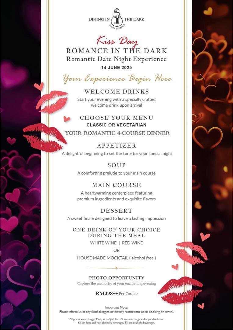 The dining experience begins with a briefing in a well-lit lounge, followed by a guided walk into the pitch-black dining area. Guests enjoy a 4-course surprise menu that changes seasonally, featuring a mix of continental and Asian-inspired dishes. Options include classic, vegetarian, and wine-pairing menus, all priced at RM188++ per person for the classic and vegetarian menus, and RM248++ for the wine-pairing menu. The menu is pork-free and prepared according to Halal standards, with modifications available for allergies or dietary restrictions.