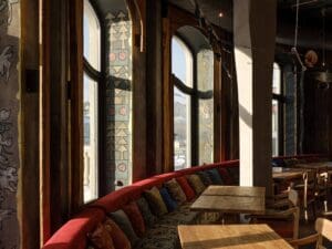Gorynych is a grill, bakery, and bar all in one, located at Rozhdestvensky Boulevard 1, in a lively part of central Moscow. The venue is part of the revived Central Market complex, and has large windows and a terrace that offer views of the boulevards. The design evokes fantasy‑Russian folklore: smoky metal, dark wood, curved stone, high ceilings, dramatic lighting, and décor that feels like a dragon’s cave. There’s an open kitchen and visible ovens, jospers, and smokers so you can see the food being prepared over fire.