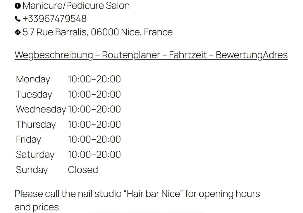 Hair Bar in Nice is a combined hair salon and beauty institute located at 5 Rue Barralis / 7 Rue Barralis, 06000 Nice. It offers a broad range of services beyond standard haircuts and colouring — including balayage, hair extensions, keratin or permanent straightening, treatments for curls, and also nail, feet & hand beauty, spa‑type treatments, and manicure/pedicure services.