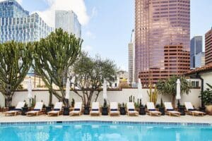 The hotel features 268 rooms and suites, each designed with warm, bohemian-inspired decor that showcases handwoven textiles, earthy tones, and curated local artwork, creating a cosy yet refined ambiance. Hotel Figueroa is known for its vibrant social spaces, including a chic outdoor pool surrounded by lush palms and cosy cabanas, providing a relaxing escape amidst the urban energy of downtown LA. The hotel also boasts two restaurants and a bar, each delivering thoughtfully crafted menus featuring fresh, locally-sourced ingredients and inventive cocktails, perfect for guests looking to experience LA’s culinary creativity right at their doorstep.