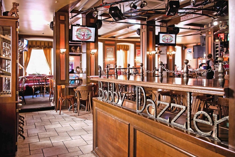 Bobby Dazzler is a renowned British-style pub situated in the heart of Moscow, at Kostyansky Lane 7/13. Established in 2003, it stands as one of the city's pioneering English-themed establishments, offering an authentic slice of British pub culture. The pub's interior is characterized by its distinctive red decor, a nod to Manchester United—reflecting the owner's passion for the club—and features elements like a classic British telephone box. With multiple televisions broadcasting international sports events, Bobby Dazzler has become a favoured spot for sports enthusiasts, particularly during significant matches.
