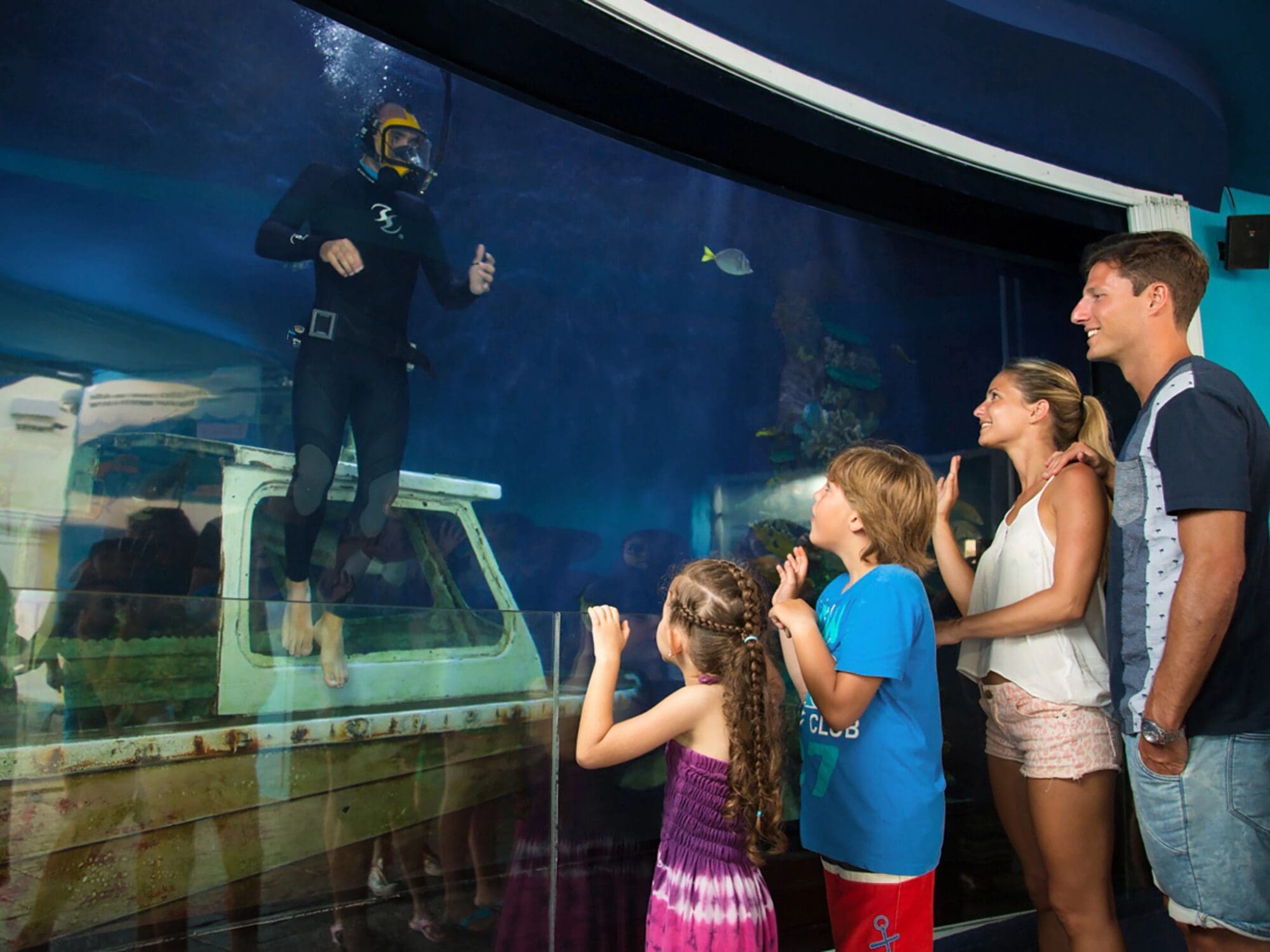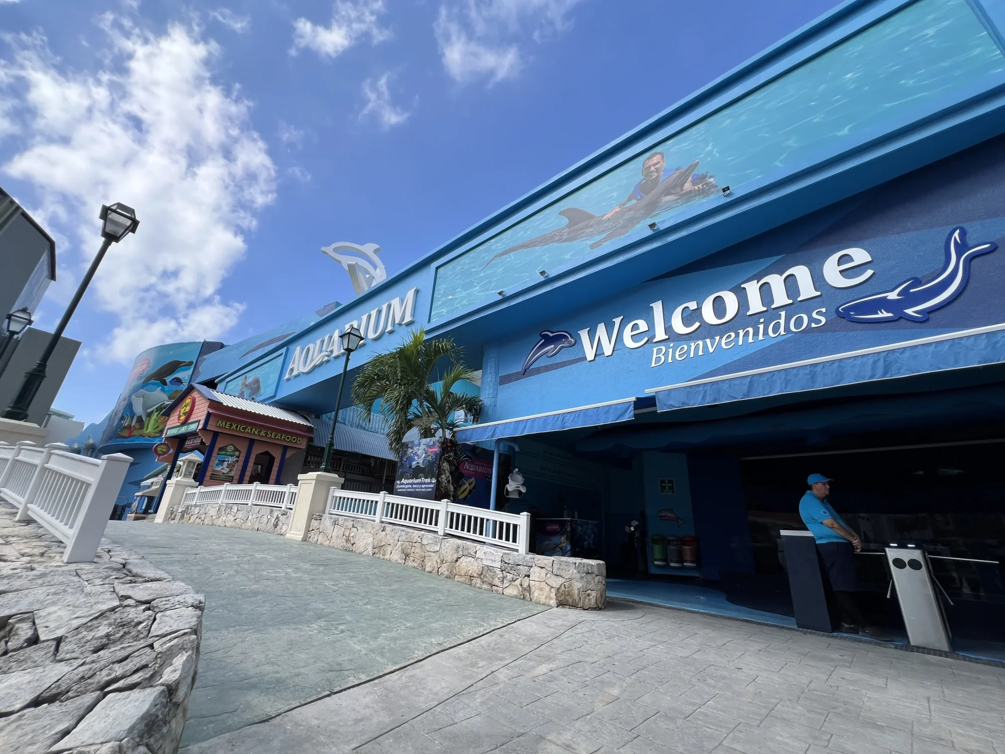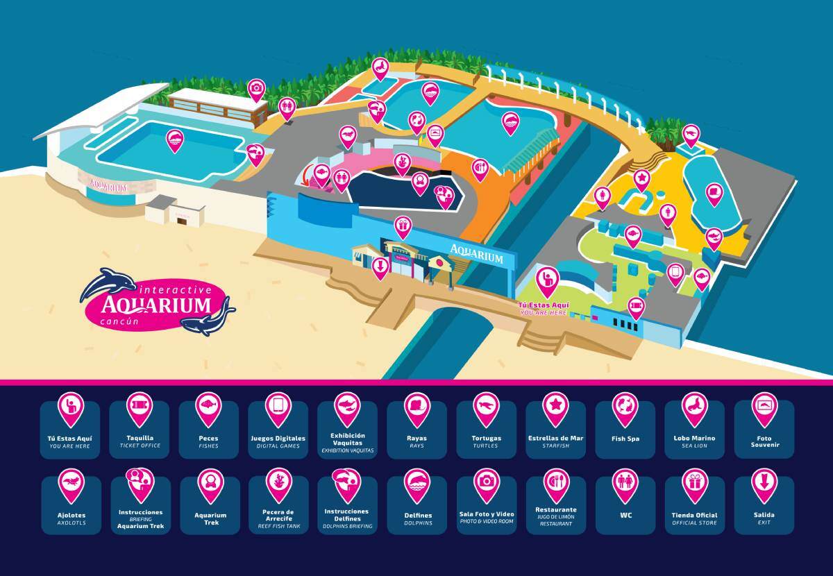 The Interactive Aquarium Cancún is located in the La Isla Shopping Village at Boulevard Kukulcán Km. 12.5, in the Hotel Zone. It’s open daily from 9:30 AM to 8:00 PM, offering a range of interactive marine experiences. General admission is approximately $15.99 USD, granting access to exhibits featuring over 140 species, including fish, rays, and axolotls. Special programs such as dolphin swims, the Aquarium Trek, and Sea Trek® are available for an additional fee. These activities are operated by Delphinus and can be booked directly at the aquarium or online.