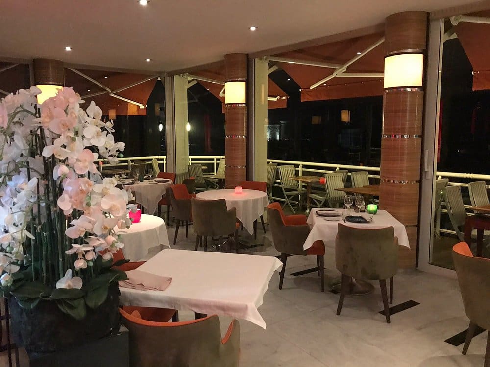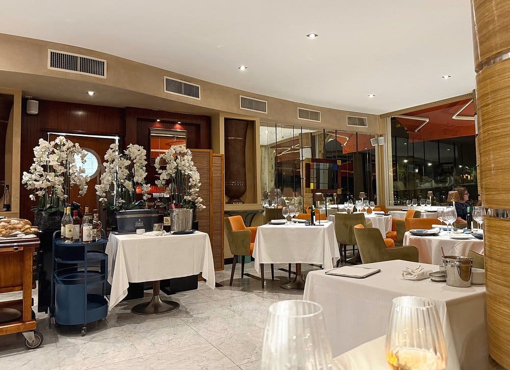 The atmosphere is elegant, sophisticated and quietly luxurious. There are several distinct dining spaces (“Houseboat”, “Double Decker”, terrace, rooftop/champagne bar in summer) each with its own mood — some more intimate, some more social. As for dress code: there’s no super formal uniform requirement stated, but “smart casual” is definitely what you’d expect. Avoid beachwear, flip‑flops, overly casual sports gear. It’s the kind of place where you’ll feel best dressed in light trousers, a nice shirt or blouse, a dress for an evening out. Also useful to know: reservations are strongly recommended (especially if you want a terrace or sea‑view table), it’s wheelchair accessible, and service tends to be attentive.