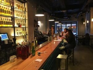 The interior of Macera TallerBar is a perfect blend of industrial chic and cosy charm, with exposed brick walls, minimalist décor, and soft lighting that creates an intimate and relaxed atmosphere. The bar’s focus on creativity is reflected in its design, with elements like large jars of macerating ingredients on display and a small, open-bar area where guests can interact with the bartenders. The venue’s cosy vibe, combined with the expert cocktail-making process, offers a refreshing alternative to more conventional drinking spots in Madrid.