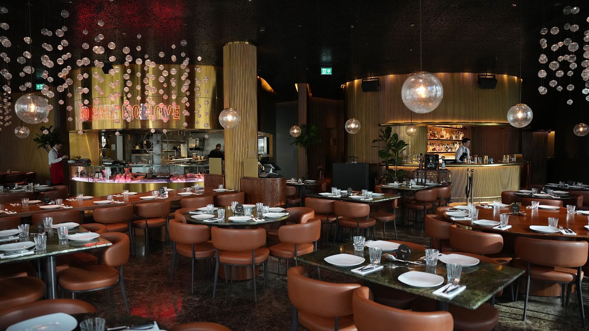 The menu at Nusr-Et features a variety of premium meats, including signature dishes like the Nusr-Et Special, a tender steak prepared tableside and served sizzling in creamy butter. Other offerings include the Ottoman Steak, a wagyu bone-in ribeye Tomahawk marinated in mustard, and the Golden Baklava, handcrafted in Gaziantep and served with Maraş ice cream. The restaurant also offers a 160 AED lunch special, which includes a starter, main course, and dessert, available daily from 12 PM to 5 PM.