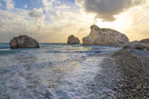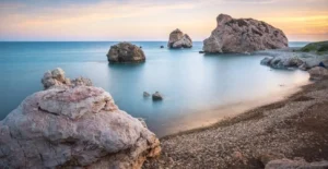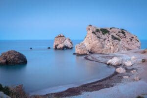 Petra tou Romiou, also known as Aphrodite’s Rock, is a striking sea stack located along the southern coast of Cyprus, approximately 25 minutes' drive east of Paphos. According to Greek mythology, this is the legendary birthplace of the goddess Aphrodite, who is said to have emerged from the sea foam here. The site is renowned for its dramatic limestone formations rising from the turquoise waters, making it a popular spot for photography, sightseeing, and romantic visits.
