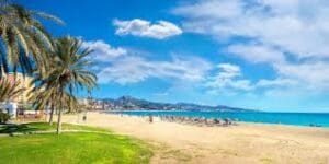 La Malagueta, between the Port of Málaga and La Caleta beach, is one of the most famous beaches for both tourists and locals. With dark sand and moderate swells, it’s 1,200 metres long and an average width of 45 metres long. It also has a palm tree-lined seafront promenade.