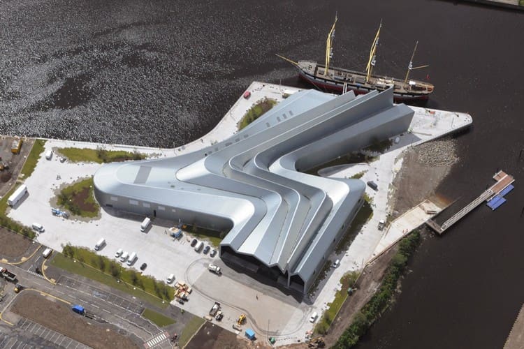 The Riverside Museum, opened in 2011 and designed by the acclaimed architect Dame Zaha Hadid, is Glasgow’s striking museum of transport and travel. Positioned on the north bank of the Clyde at the junction of the River Clyde and River Kelvin, the flowing roofline of glass and zinc echoes the city's shipbuilding past, forming a jagged, wave-like façade reminiscent of industrial cranes and hulls. This bold architectural gesture glides from the urban center toward the riverside, symbolizing the dynamic relationship between Glasgow's industrial heritage and contemporary creativity Zaha Hadid Architects.