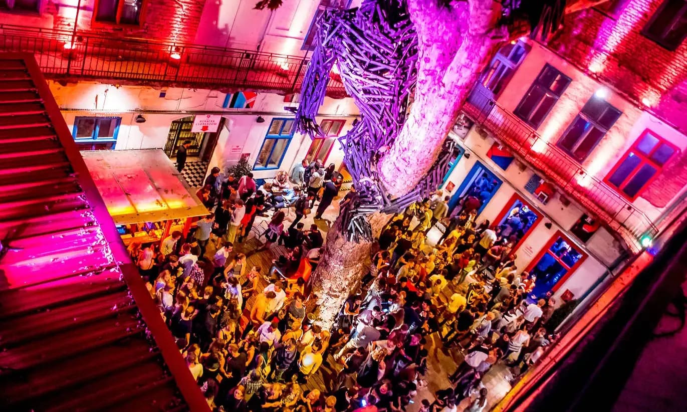 Each ruin bar has its own character. The Instant–Fogas Complex is a massive party hub with multiple dance floors, bars, and rooftop lounges, perfect for late-night revellers. Others, like Mazel Tov, offer a more upscale, dinner-friendly vibe with Mediterranean food and live music in a plant-filled courtyard. Budget-friendly spots like Füge Udvar or UdvarROM attract a younger, more local crowd, while places like Kőleves Kert or Csendes Vintage Bar lean toward cosy and artistic. There are also beer-focused venues like Élesztőház, located in a former glass factory, and Kertem, a leafy open-air bar near City Park.