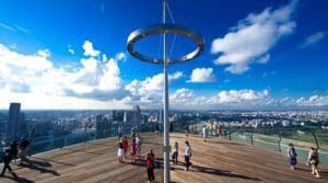 The Sands SkyPark Observation Deck is an architectural marvel perched atop the iconic Marina Bay Sands resort in Singapore. This stunning rooftop venue spans an area of 12,400 square meters and offers breath-taking 360-degree views of the city’s skyline, the Marina Bay, and the Singapore Strait. At a height of 200 meters above ground, the deck features an infinity pool, lush gardens, and spacious observation areas, making it an ideal spot for tourists and locals alike to soak in the panoramic scenery. The sleek design of the SkyPark is a testament to modern engineering and provides a unique vantage point from which to appreciate the beauty of Singapore.