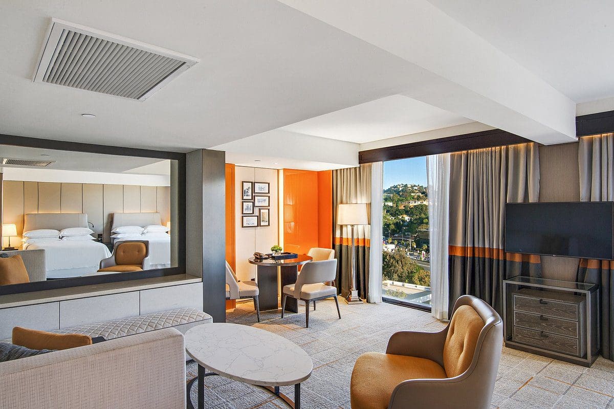 The Sheraton Universal Hotel is a sophisticated 4-star hotel known for its close proximity to Universal Studios Hollywood, making it an ideal choice for travellers looking to stay near one of Los Angeles’ most popular attractions. Located just minutes from the entrance of Universal Studios and the vibrant Universal CityWalk, the hotel also offers convenient access to Hollywood’s Walk of Fame, the Griffith Observatory, and other famous LA landmarks. Its location on the hills of Universal City gives guests a scenic view of the Hollywood Hills and a front-row seat to the world of entertainment.