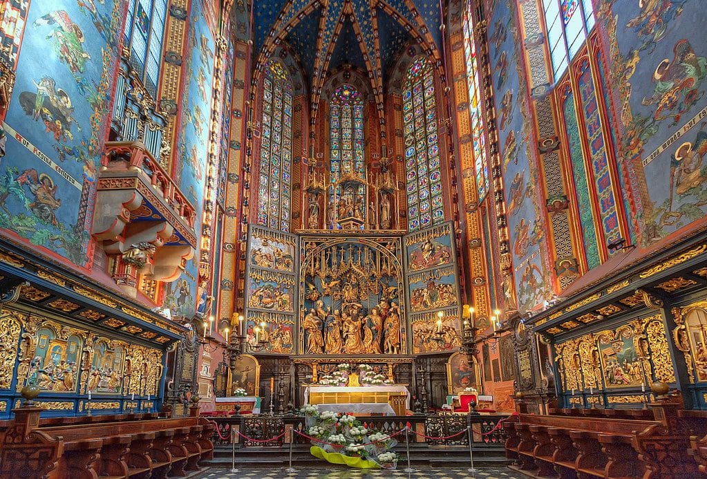 Visitors to St. Mary’s Basilica can admire its stunning interior, which features elaborate Gothic altarpieces, intricate stained glass windows, and beautifully painted ceilings. The Bugle Tower, also known as the Hejnal Tower, is an important feature of the basilica. It houses the Hejnal Mariacki, a traditional bugle call played every hour, and its distinctive melody is broadcast from the tower to mark the time and honour the city’s history. The tower also offers panoramic views of the city, providing visitors with a unique vantage point to appreciate Kraków's historical architecture and vibrant urban landscape.