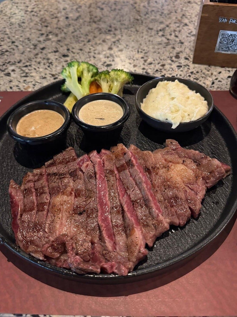 The menu centres on steaks, burgers, and hand‑helds, with a particular emphasis on quality meats. Their signature Wagyu beef steaks are chargrilled and served with a secret pepper sauce. There are also handmade sandwich/burger options and fresh dessert offerings like homemade cheesecake. Non‑meat items and lighter sides are available as well, so there’s something for those not after a big steak. Portions are generous and many guests comment on the flavour and quality of the meat.