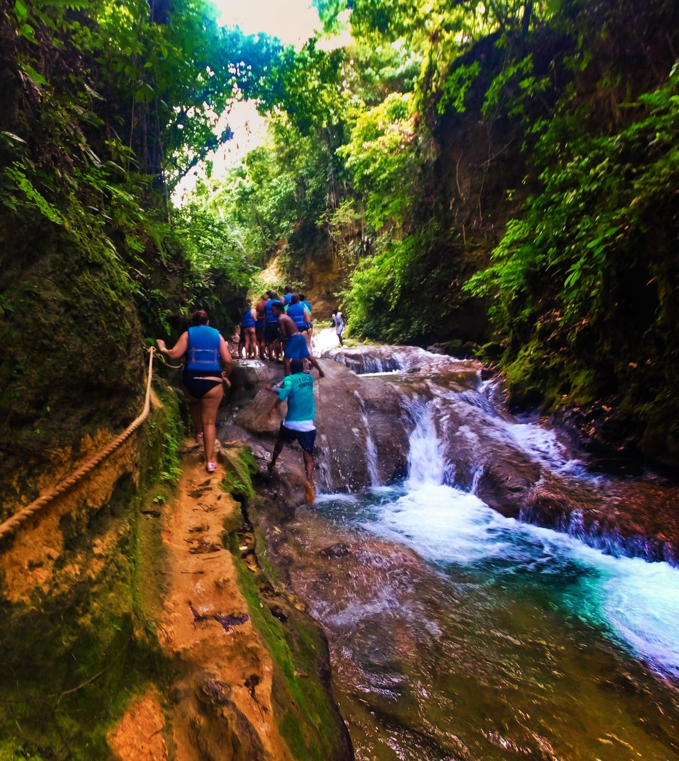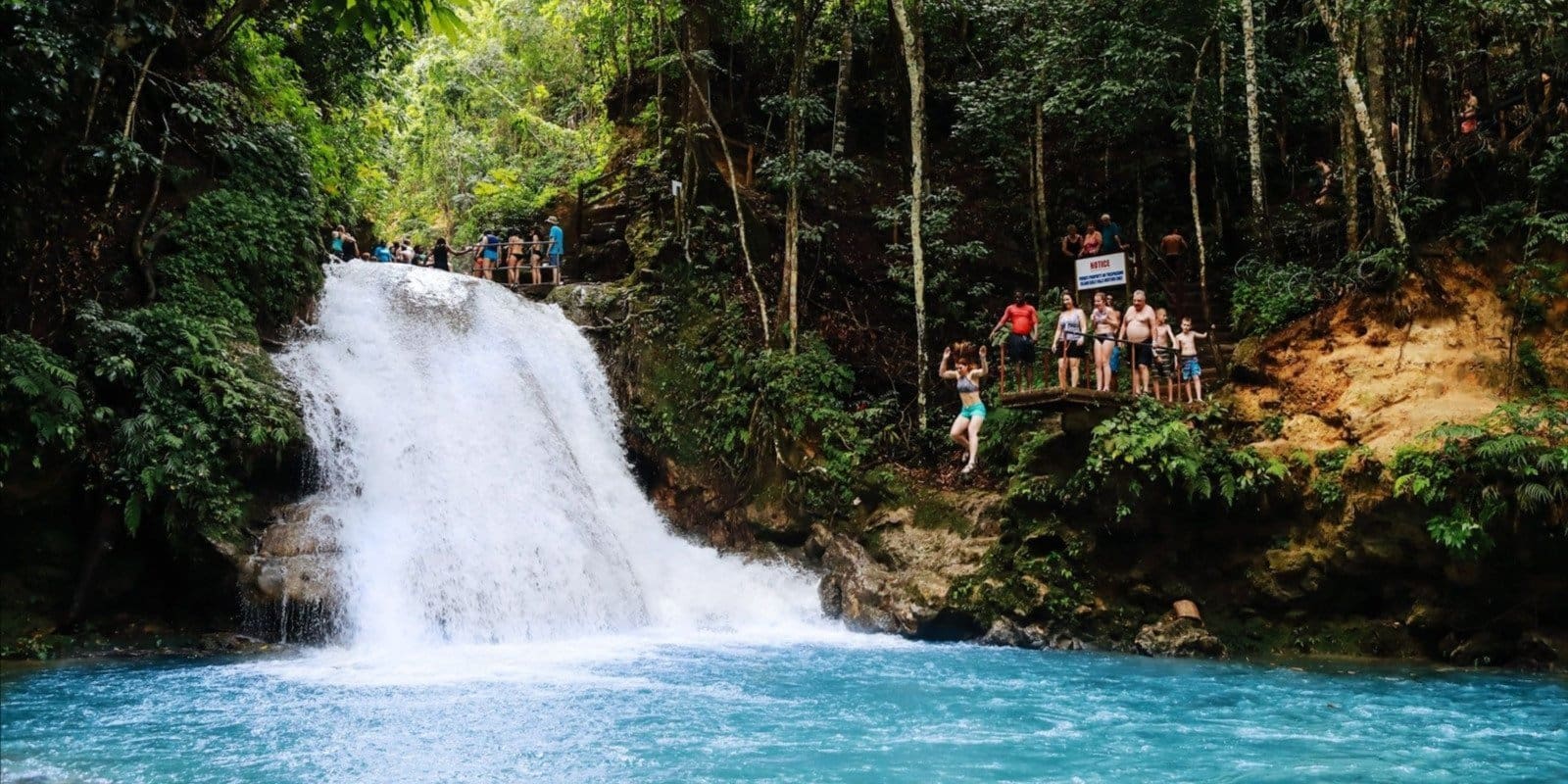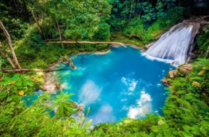 The Original Blue Hole is a natural swimming site in St Ann Parish, about 20‑30 minutes outside Ocho Rios, in a community called Thatch Hill. It’s set in a lush tropical environment with forest, river pools, waterfalls, natural springs, rope swings, cliff‑jumps, and caves, offering a mix of adventure and relaxation. The water is a striking blue‑green, especially around midday, and there are spots where you can swim, jump from rocks or platforms, explore small underwater caves, or just chill in the pools. Guides are typically on hand to escort visitors through the more challenging parts and ensure safety.