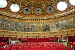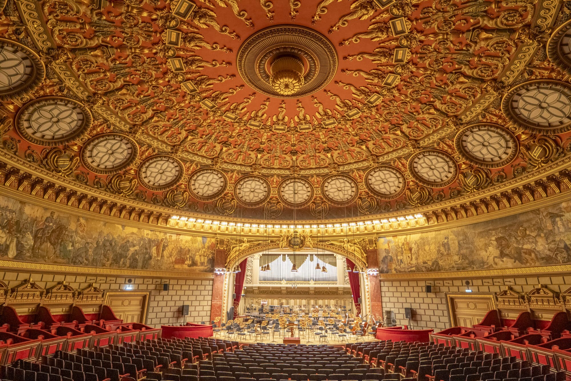 Architecturally, the building is distinguished by its circular design and grand dome, standing 41 meters tall. The façade features six Ionic columns and a mosaic pediment depicting Romanian historical figures. Inside, the concert hall boasts a 75-meter fresco by Costin Petrescu, illustrating key moments in Romanian history from the Dacian Wars to the unification of Greater Romania. The acoustics and design of the space contribute to its reputation as one of Europe's finest concert venues.