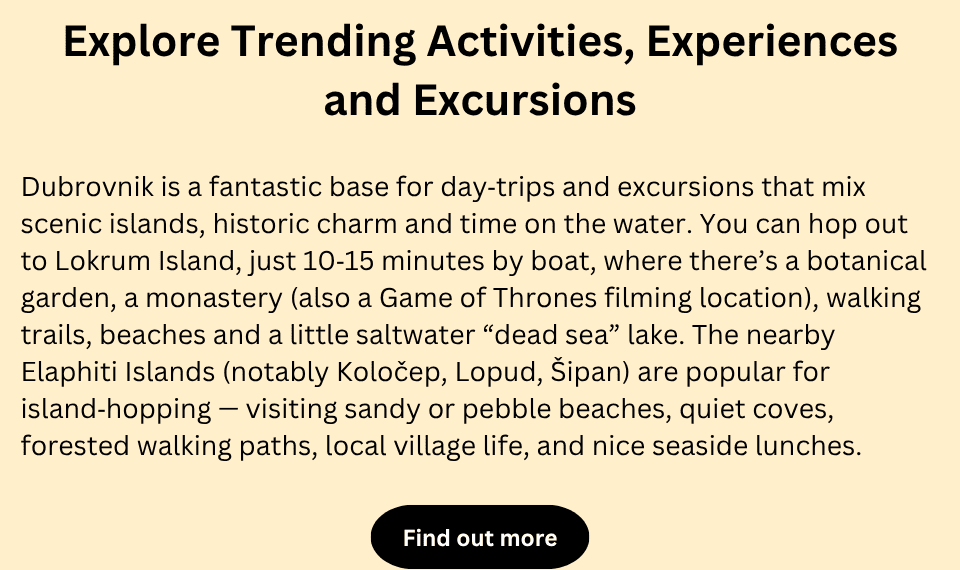Mount Srđ – Take the cable car or hike up for panoramic views over Dubrovnik and the Adriatic.
