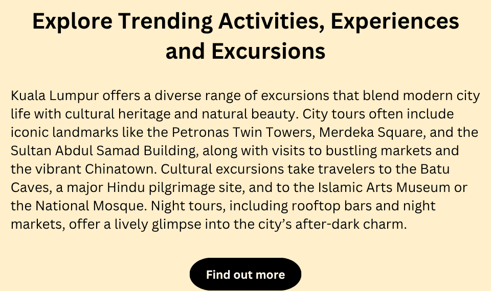 Kuala Lumpur, the bustling capital of Malaysia, is a dynamic city known for its towering skyline, diverse culture, and mouthwatering street food. The iconic Petronas Twin Towers dominate the cityscape, while nearby attractions like Batu Caves and Merdeka Square showcase the city’s rich heritage. Vibrant districts such as Bukit Bintang offer top-notch shopping and nightlife, while Chinatown and Little India reflect KL’s multicultural charm. From ultra-modern malls to historic mosques, Kuala Lumpur offers an energetic blend of the old and new.