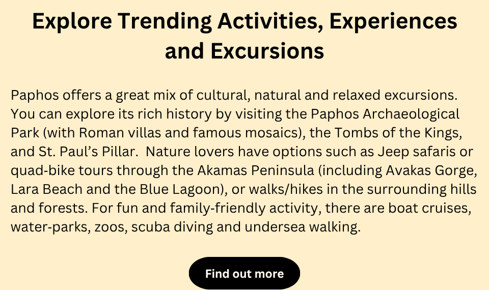 Paphos, located on the southwest coast of Cyprus, is a UNESCO World Heritage city known for its ancient ruins, beautiful coastline, and mythological ties to Aphrodite. Visitors are drawn to landmarks like the Tombs of the Kings, Paphos Castle, and the mosaics of the Roman villas in Kato Paphos. The city blends laid-back Mediterranean charm with rich history, scenic harbors, and excellent local cuisine. Whether you’re exploring archaeological wonders or relaxing by the sea, Paphos offers a perfect mix of culture and leisure.